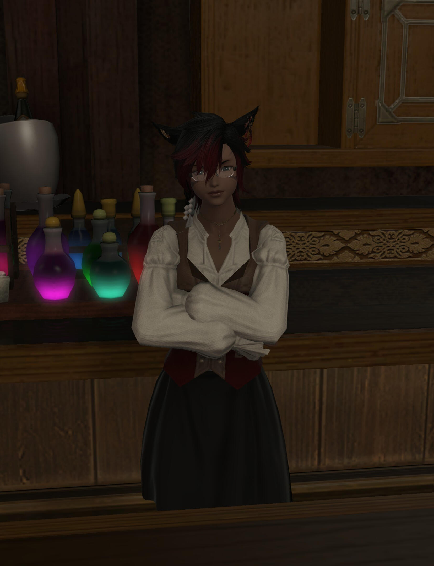 Felix simply was. She didn’t remember anything of her childhood or her origins, and she didn’t really care to. Her earliest memories go back to Gridania, where she was informally adopted by the Botanist’s Guild after they had found her foraging in the Shroud. She quickly developed an affinity for plants and nature, and rightfully so, since she spent so much of her time in the woods. The young Miqo’te found solace and safety amongst the trees; steadfast beings that she could trust to never hurt her. As she grew older she learned more skills. Hunting, carpentry, leatherworking, it all came easily to her. She became a jack of all trades and was able to turn a pretty penny off her talents. Hearing of the discovery of the Diadem, and by extension, all the new species of flora, Felix traveled to Ishagard.Ishgard, with its freezing weather and colder hearts, proved to be quite the change of pace from the quaintness of Gridania. The woods she trusted so much were no longer there, having been replaced by stone walls and machinery. Despite this, she kept her head down and focused on her goals; after all, those new species wouldn’t catalog themselves. As her works grew, so too did her reputation as a botanist. This would eventually lead her to meeting her now good friend, Gog Magog.The Felix that you’d run into at Bottom of the Barrel is a friendly and energetic tradeswoman. She offers any sorts of services that you could ask for, ranging from the mundane to the more illicit. She is fiercely loyal to her two friends, Sypha Mol and Gog Magog, the only two people she can truly trust. She believes herself to be right in all things she does and will cheerfully do things with no concern for how they’ll affect other people. She cares for her plants more than she could ever care for another. If you can somehow get close enough to her, maybe someday she will show you all the secrets she has hid.